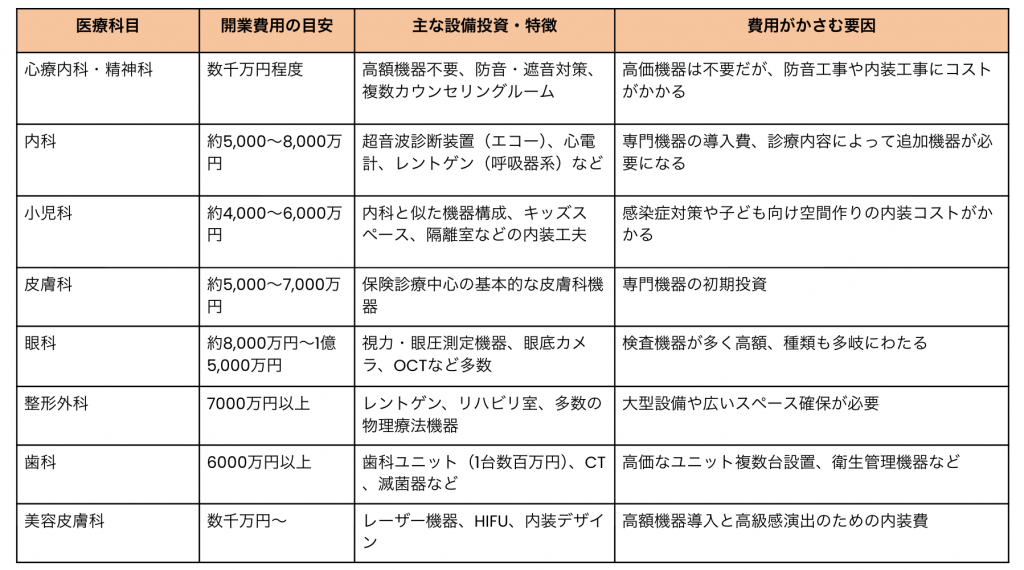 開業費用の中で、診療科目による差が最も大きく現れるのが、この「医療機器費」です。